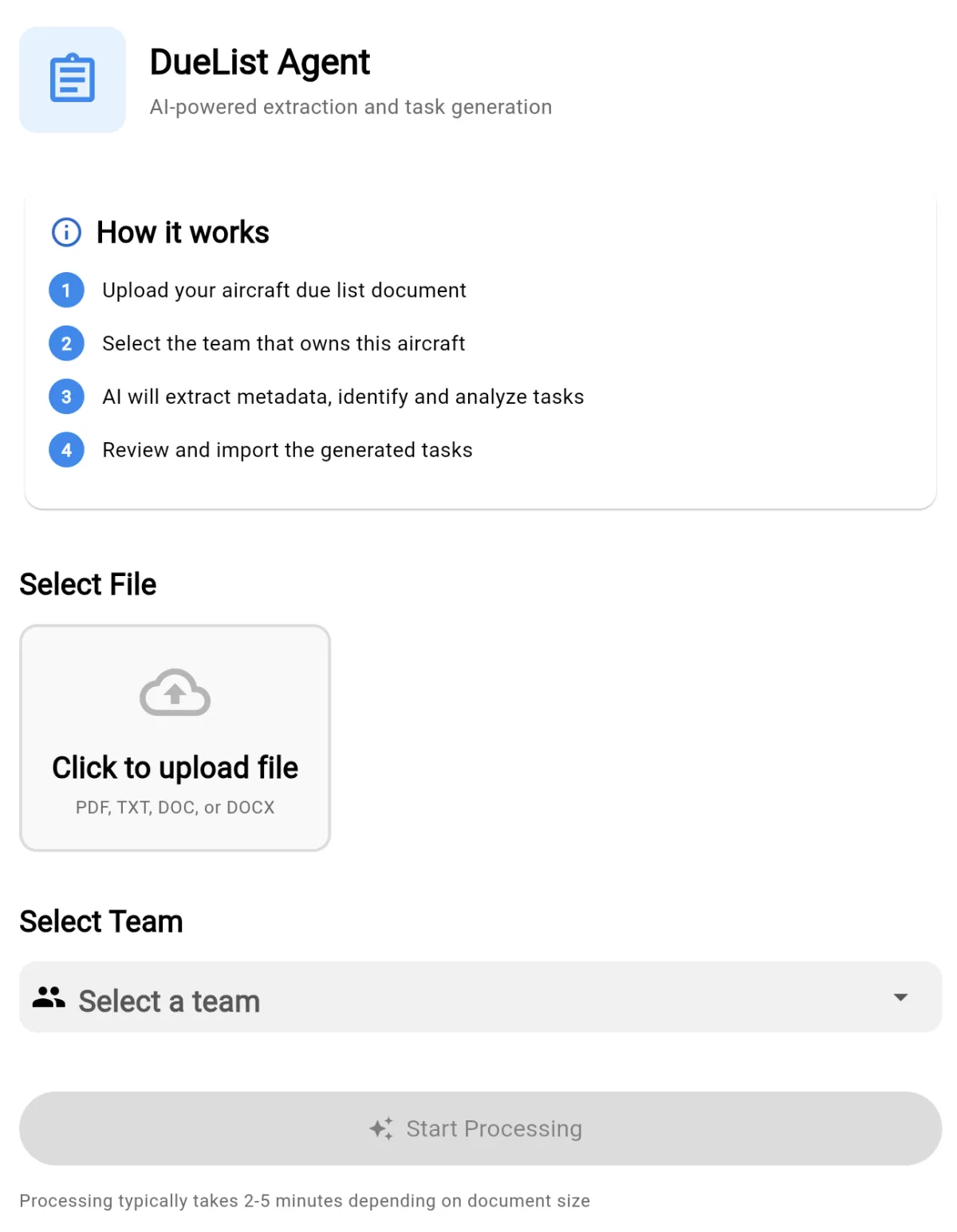 Manual due list processing slows operations, creates information gaps, and leaves room for costly oversights. A single missed task or incorrect part can disrupt schedules, increase maintenance costs, and compromise safety. The Due List Agent eliminates these risks by transforming traditional due list processing into an intelligent, AI-driven planning system. It scans, prioritizes, and itemizes upcoming maintenance needs — keeping your team efficient, compliant, and always one step ahead..