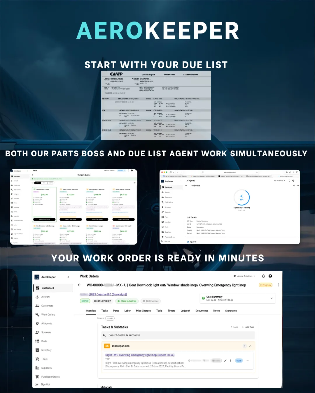 AeroKeeper is an AI-driven maintenance platform designed to modernize MRO operations through a coordinated system of intelligent agents. By integrating the Due List, Parts Boss, and Logbook Agents, the platform transforms manual due lists into structured workflows, generating work orders, quotes, and compliance insights in minutes. This unified approach combines advanced AI coordination with a complete management suite - including inventory, parts tracking, and purchase orders - to eliminate operational silos, reduce downtime, and maintain continuous aircraft readiness.
